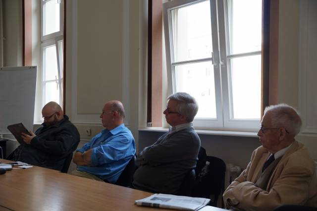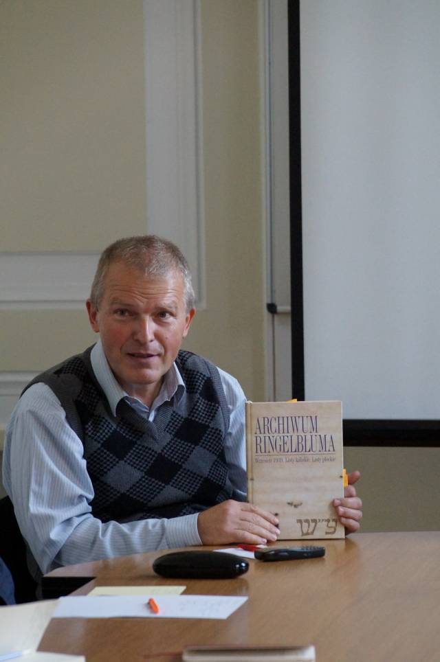 W trakcie naszego spotkania goście zaprezentowali najnowszy tom naukowej całości edycji Archiwum Ringelbluma – Podziemnego Archiwum Getta Warszawskiego. Składa się on z trzech odrębnych części, z których każda ma inny charakter: część dotycząca września 1939 r. to zbiór relacji Żydów – uczestników wojny obronnej oraz jeńców wojennych w obozach niemieckich. W kolejnych częściach znajdują się dwie wydzielone kolekcje korespondencji, wyodrębnione już w czasie wojny przez archiwistów „Oneg Szabat”. Listy kaliskie zawierają różnorodną korespondencję z lat 1939 – 1941 Żydów zamieszkałych w Kaliszu lub pochodzących stamtąd. Kolekcja listów płockich to listy Żydów przesiedlonych z Płocka na Kielecczyznę w marcu 1941 r. skierowane do ziomkostwa płockiego w getcie warszawskim.