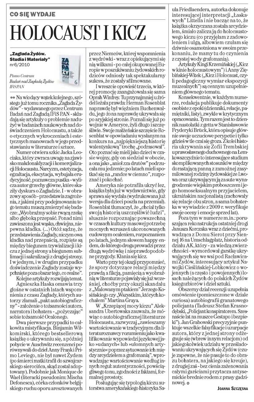 Na łamach piątkowej (11.02.2011) Gazety Wyborczej Joanna Szczęsna w artykule zatytułowanym Holocaust i kicz omawia 6 numer "Zagłady Żydów. Studia i Materiały".