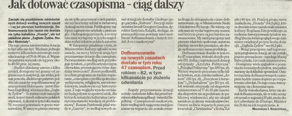 Według ogłoszonych właśnie wyników naboru wniosków na kolejna transzę dotacji w roku 2013 "Zagłada Żydów" nie została uwzględniona wśród periodyków dotowanych. Stało się to w wyniku ogłoszonych 'za przysłowiowe pięć dwunasta' zasad, według których resort postanowił wyeliminować ze stawki pisma o profilu historycznym i naukowym.