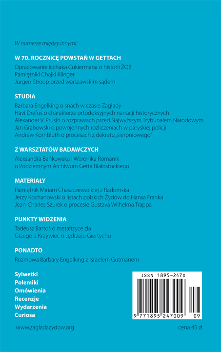 Tematem przewodnim tomu jest problematyka źródeł historycznych do badań nad Zagładą i sposobów ich interpretacji. Do tego zagadnienia powracamy w każdym dziale pisma. W osobnej sekcji związanej z przypadającą w tym roku 70. rocznicą powstań w gettach warszawskim i białostockim, prób oporu w Częstochowie i Będzinie, a wreszcie buntów w obozach zagłady w Treblince i Sobiborze publikujemy trzy ważne świadectwa. Pierwsze z nich to sprawozdanie komendanta Żydowskiej Organizacji Bojowej Icchaka Cukiermana „Antka” na temat tworzenia organizacji bojowej w getcie warszawskim i przebiegu walk, wysłane do Londynu wiosną 1944 r., stanowiące pierwsze całościowe opracowanie dziejów ŻOB, którego znaczenia jako tworzywa dla narracji historycznych nie sposób przecenić. Zapiski Chajki Klinger, członkini kierownictwa Ha-Szomer ha-Cair i ŻOB w Będzinie, mają zupełnie inny charakter. Jest to pisany w ukryciu po wydostaniu się z getta pod koniec 1943 r. osobny, emocjonalny, miejscami skrajnie krytyczny zapis, niepozbawiony drastycznych szczegółów. To pierwsza publikacja polskiego oryginału; izraelskie wydania ocenzurowano jako niepasujące do heroicznej wersji historii. Wstęp, zawierający omówienie całości zapisków Chajki oraz jej tragiczne losy, napisał jej syn Avihu Ronen (publikujemy również recenzję jego wydanej niedawno książki prezentującej to źródło). Kolejnym materiałem nawiązującym do tematyki rocznicowej są zeznania Jürgena Stroopa złożone 19 lipca 1951 r. przed Sądem Wojewódzkim w Warszawie. Przygotowująca edycję stenogramu Katarzyna Person wprowadza w szerszy kontekst toczącego się przeciwko Stroopowi postępowania sądowego i omawia zawartość dokumentacji zebranej na potrzeby procesu. Po raz pierwszy, jako że dokument ten nie był nigdy wcześniej publikowany, zostajemy skonfrontowani z autentycznymi słowami Stroopa przekazanymi bez pośredników, a co za tym idzie – bez nieuniknionych zniekształceń. Jest to dokument wstrząsający, stanowiący uzupełnienie dokumentacji dotyczącej powstania. W kontekście rocznicy walki Żydów na uwagę zasługują również tekst autorstwa Aleksandry Bańkowskiej i Weroniki Romanik poświęcony konspiracyjnemu archiwum getta białostockiego i Mordechajowi Tenenbaumowi (sekcja „Z warsztatów badawczych”), a także artykuł Agnieszki Haski przedstawiający sylwetkę doktora Juliana Chorążyckiego, jednego z twórców konspiracji w obozie zagłady w Treblince. Dział „Studia” zawiera sześć artykułów, których autorzy wykorzystują najróżniejsze rodzaje materiałów źródłowych. Barbara Engelking proponuje nowatorskie spojrzenie na sny jako źródło do badań nad Zagładą. Havi Dreyfus odczytuje praktycznie nieznane w Polsce narracje historyczne ortodoksyjnych Żydów dotyczące życia religijnego pod okupacją. Piotr Filipkowski pisze o archiwach historii mówionej, specyfice tych źródeł i sposobach ich interpretacji. Cztery kolejne teksty dotyczą powojennych rozliczeń ze zbrodniami nazistowskimi. Alexander Prusin omawia siedem procesów przeciwko zbrodniarzom nazistowskim (m.in. Rudolfowi Hössowi, Arthurowi Greiserowi, Amonowi Göthowi, Ludwigowi Fischerowi) toczonych przed Najwyższym Trybunałem Narodowym w latach 1946–1948 oraz ich kontekst prawno-historyczny. Artykuł Jana Grabowskiego traktuje o specyfice powojennych rozliczeń w paryskiej policji w związku z uczestnictwem tej formacji w prześladowaniach Żydów. Andrew Kornbluth omawia procedury sądowe stosowane wobec osób oskarżonych o popełnienie zbrodni na Żydach. Na specjalną uwagę zasługuje opracowanie Jerome’a S. Legge’a, zawierające analizę działań podejmowanych przez przedstawicieli niemieckich Kościołów na rzecz zbrodniarzy wojennych osądzonych przez Amerykański Trybunał Wojskowy, dokonaną na podstawie odtajnionych kilkanaście lat temu akt amerykańskiego kontrwywiadu. Pewne analogie z postrzeganiem powojennych rozliczeń kolaborantów w Polsce warte są, jak sądzimy, głębszego namysłu. W sekcji „Materiały” znajdzie czytelnik dokumenty z procesu Wilhelma Trappa, dowódcy 101 Batalionu Policji Porządkowej, toczącego się w lipcu 1948 r. w Polsce, opracowane przez Jeana-Charles’a Szurka. Zastanawia się on nad przyczynami całkowitego pominięcia w śledztwie i sentencji wyroku mordów Żydów dokonanych przez formację dowodzoną przez Trappa na Lubelszczyźnie. Na uwagę zasługuje również publikowany po raz pierwszy dziennik nastolatki z Radomska Miriam Chaszczewackiej, zamordowanej w Treblince, w opracowaniu Feliksa Tycha, który znał ją osobiście. Do działu „Curiosa” trafia tym razem niespełniająca kryteriów naukowych publikacja dotycząca zagadnienia pomocy udzielanej Żydom, która odegrała negatywną rolę w kontekście powstawania sejmowej inicjatywy upamiętnienia uczestników buntu w Treblince. * * * W zeszłym roku ubolewaliśmy nad przemilczeniem przez władze państwowe 70. rocznicy rozpoczęcia masowego mordu na Żydach polskich. W tym roku byliśmy świadkami z jednej strony instrumentalizacji i rytualizacji obchodów rocznicowych, z drugiej zaś patriotycznego wzmożenia, aż po nadużycia i manipulacje, by przywołać sprawę publikacji skandalicznego wystąpienia Krzysztofa Jasiewicza na łamach magazynu historycznego „Focus Historia” w numerze poświęconym rocznicy powstania w getcie warszawskim. Jako redakcja pisma naukowego zajmującego się Zagładą nie mogliśmy pozostać w tej sprawie obojętni. Nie zaskoczyła nas pryncypialna reakcja przedstawicieli elit intelektualnych i naukowych, którzy udzielili wsparcia naszym działaniom, zaskoczyła natomiast skala poparcia dla obskurantyzmu, również pod pretekstem obrony wolności nauki. Z przykrością odnotowaliśmy także brak głębszej refleksji ze strony redakcji pisma, które użyczyło Jasiewiczowi miejsca. Reagowaliśmy również w kwestii popieranej pr