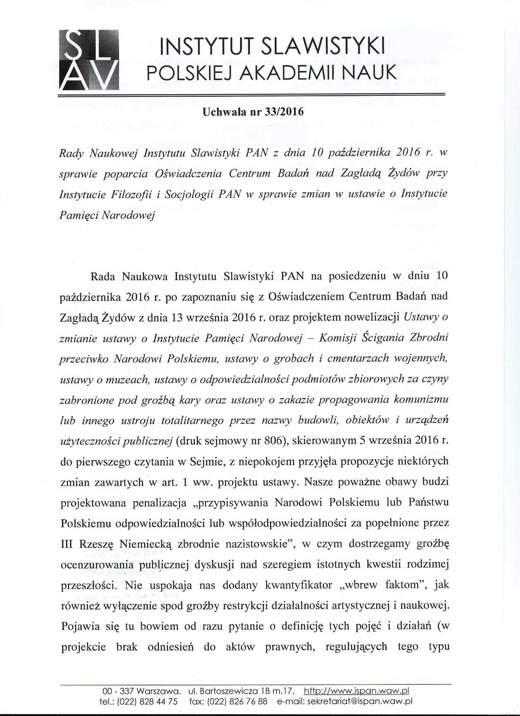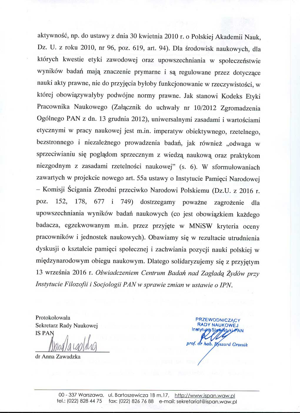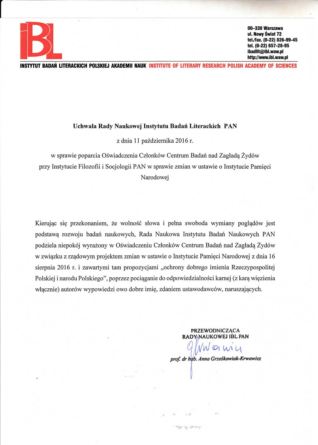 Rady Naukowe Instytutu Badań Literackich PAN oraz Instytutu Slawistyki PAN zdecydowały o wsparciu głosu sprzeciwu Centrum wobec przyjętym przez Radę Ministrów i procedowanego przez Sejm projektu zmian w ustawie o IPN, zmierzającym de facto do ograniczenia swobody wypowiedzi, badań naukowych i penalizacji popularyzacji wyników badań