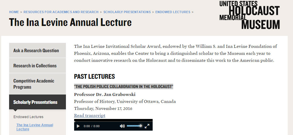 Prof. Jan Grabowski w listopadzie br. w ramach The Ina Levine Annual Lecture w United States Holocaust Memorial Museum w Waszyngtonie wygłosił wykład zatytułowany "THE POLISH POLICE COLLABORATION IN THE HOLOCAUST"