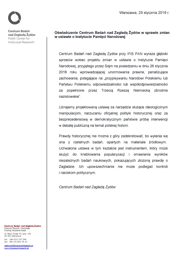 Centrum Badań nad Zagładą Żydów przy IFiS PAN wyraża głęboki sprzeciw wobec projektu zmian w ustawie o Instytucie Pamięci Narodowej, przyjętego przez Sejm na posiedzeniu w dniu 26 stycznia 2018 roku wprowadzającej unormowania prawne, penalizujące zachowania, polegające na „przypisywaniu Narodowi Polskiemu lub Państwu Polskiemu odpowiedzialności lub współodpowiedzialności za popełnione przez Trzecią Rzeszę Niemiecką zbrodnie nazistowskie”.