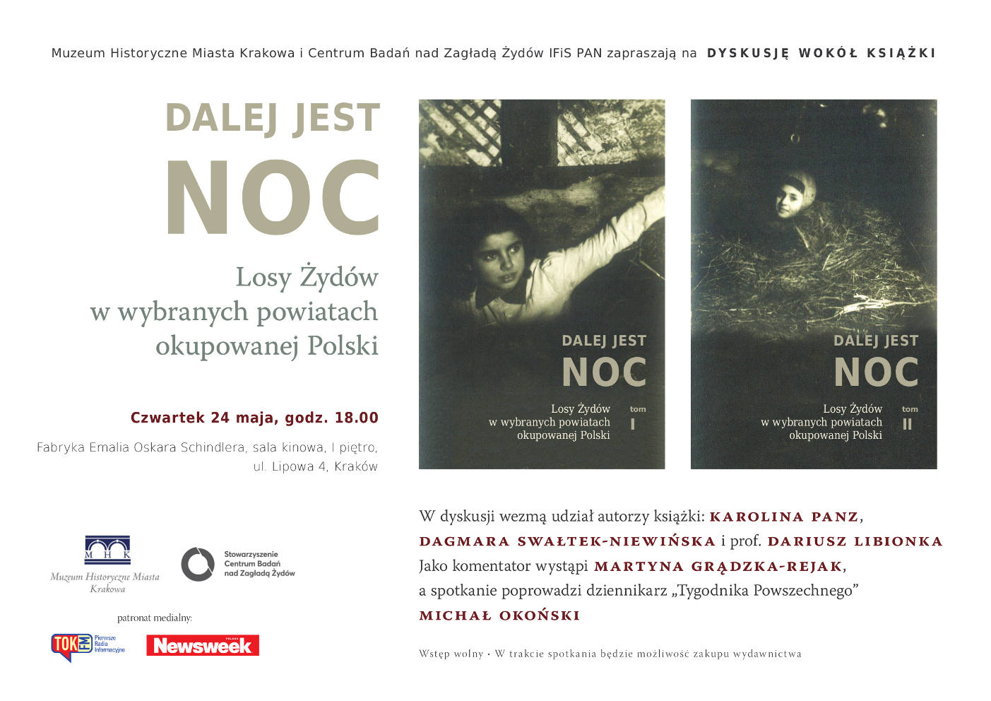 24 maja o godz. 18.00 wspólnie z Muzeum Historycznym Miasta Krakowa zapraszamy na spotkanie z dr hab. Dariuszem Libionką, Karoliną Panz oraz Dagmarą Swałtek-Niewińską wokół książki "Dalej jest noc. Losy Żydów w wybranych powiatach okupowanej Polski"