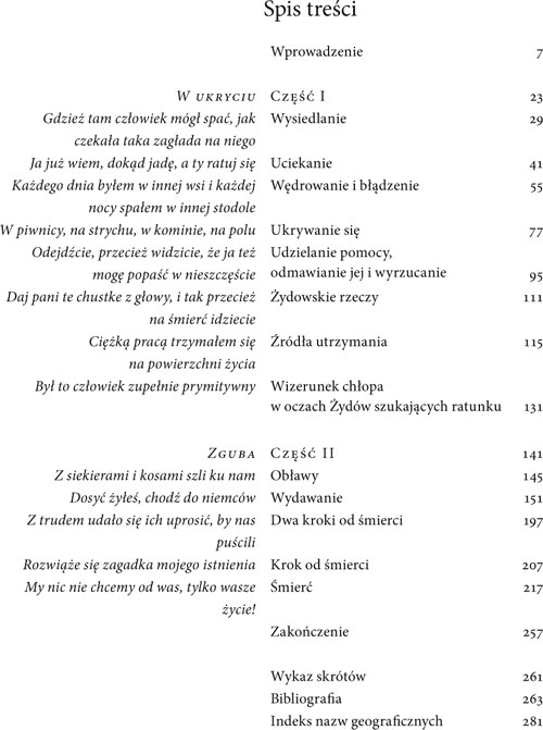 Książka opowiada o wędrówce w poszukiwaniu ratunku przed Zagładą, która najczęściej okazywała się bezskuteczna i kończyła zgubą. U jej kresu rzadko czekało ocalenie, najczęściej – zdrada lub śmierć. Najczęściej – bo przeżyła mniejszość spośród tych, którzy chcieli się ratować. Większość tych odważnych, zdeterminowanych i gotowych do poświęceń ludzi – zginęła. Wielu zostało zamordowanych przez Niemców w krótkim czasie zaraz po likwidacji gett. Niektórzy zmarli z głodu, zimna czy chorób. Inni zostali wydani Niemcom przez Polaków lub przez samych Polaków zamordowani.
