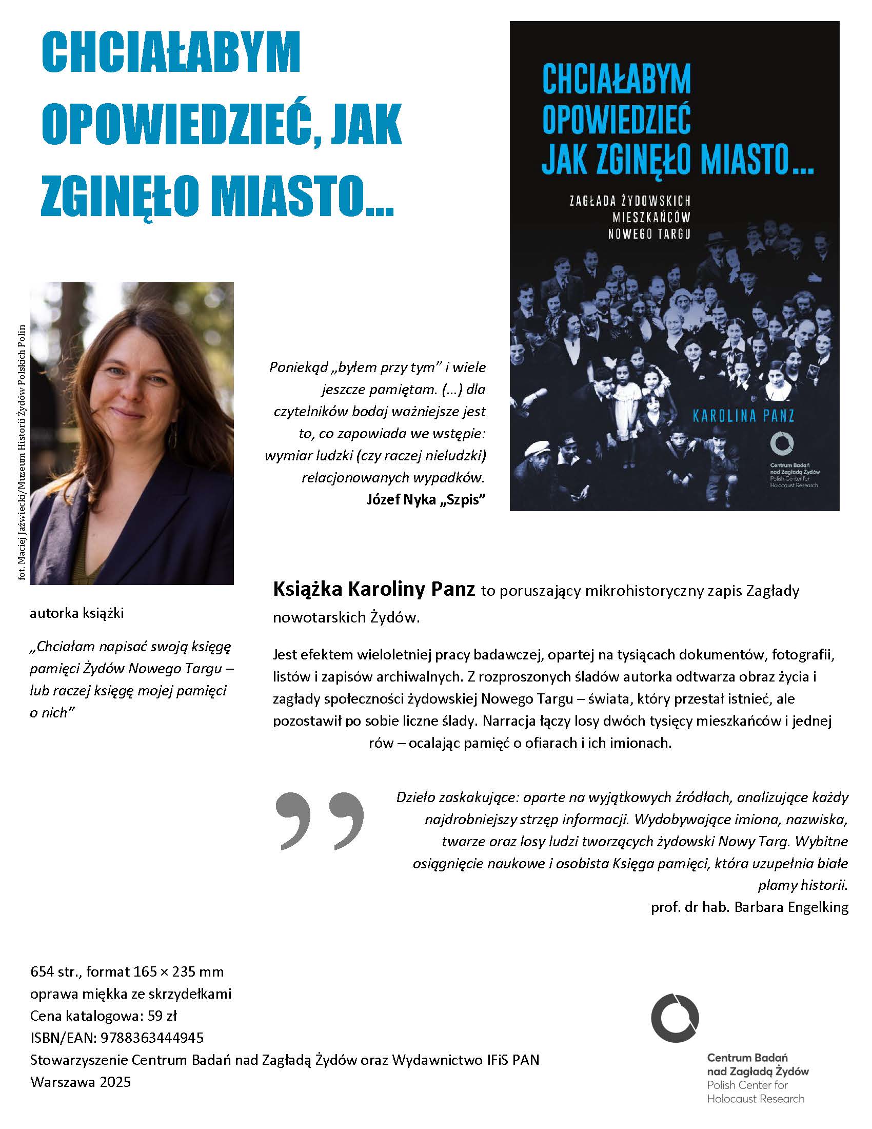Praca Karoliny Panz jest dziełem zaskakującym. Autorka analizuje każdy najdrobniejszy strzęp informacji o nowotarskich Żydach odnaleziony w jednym z wielu spenetrowanych archiwów. Niezwykle szczegółowo przedstawia obraz przedwojennej rzeczywistości, wojennego chaosu, narastającego terroru okupacyjnego i żydowskiej walki o przetrwanie. Z ogromną determinacją przypomina imiona, nazwiska, twarze oraz losy ofiar. Korzysta z rzadko przywoływanych źródeł i opisuje unikatowe wątki (m.in. getto-niegetto, żydowsko-góralska sieć przemytnicza czy Goralenvolk). To wyjątkowa, osobista Księga pamięci, która uzupełnia białe plamy historii. Uważam ją za wybitne osiągnięcie naukowe.